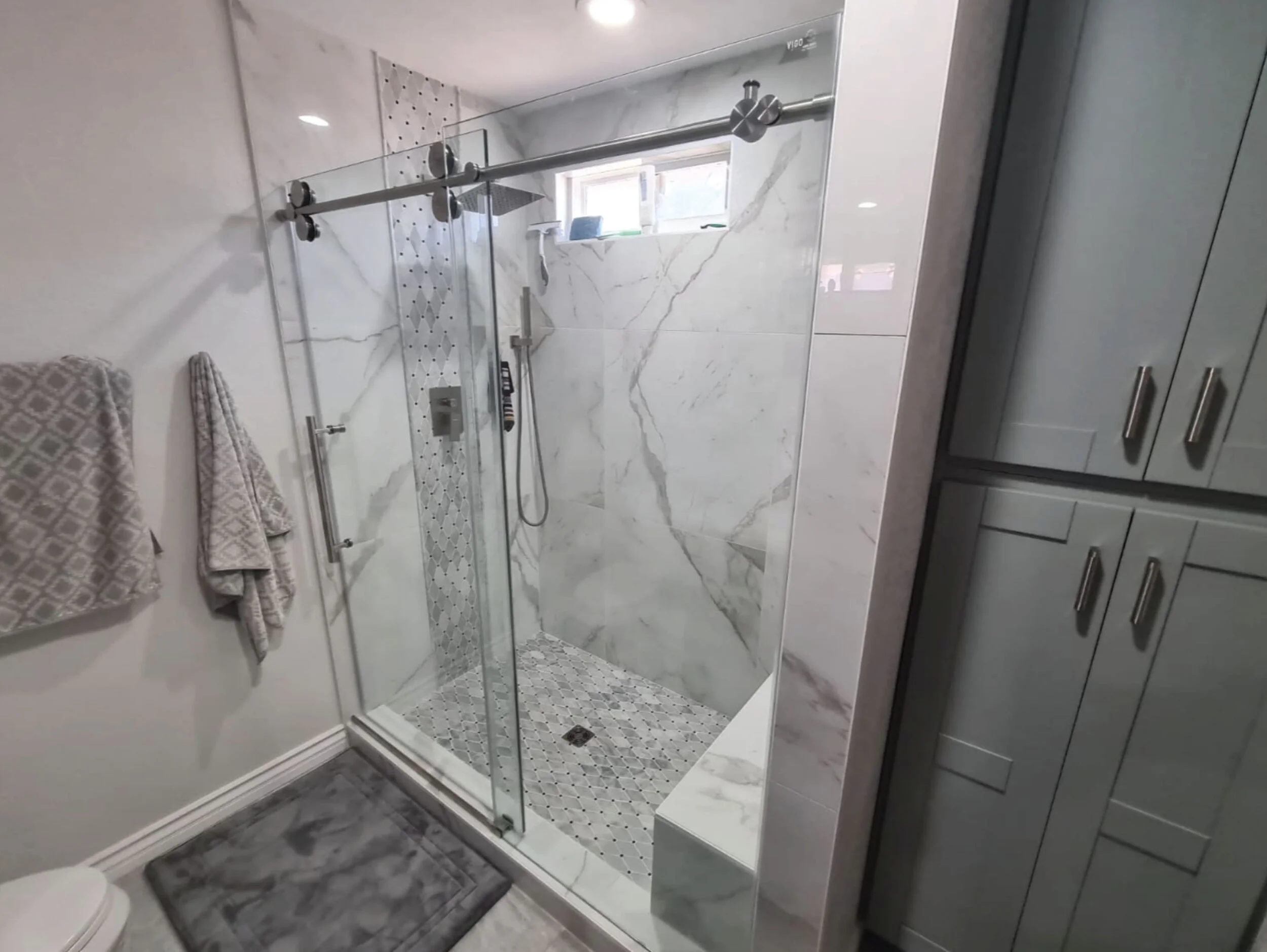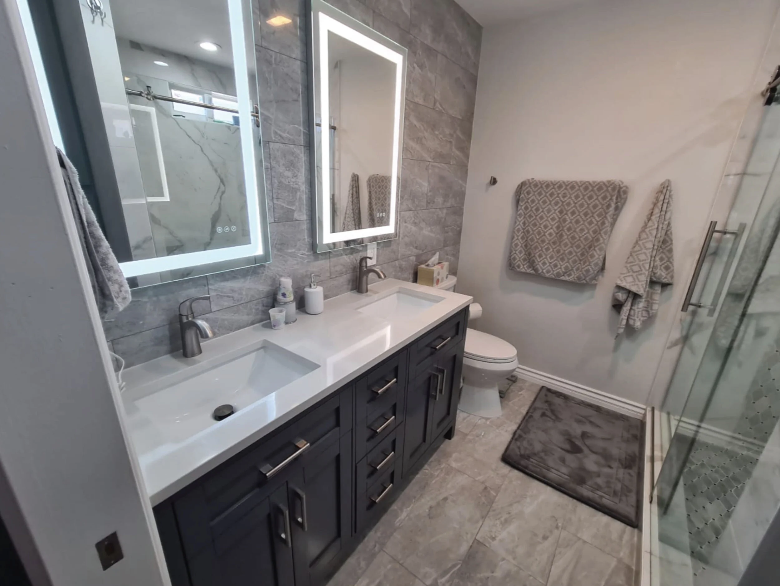 From white marble shower walls to navy blue cabinets, Eco Home Builders can do it all. Select all walls tiles, shower floor, flooring, cabinets, countertops, sinks, faucets, toilets, and LED mirrors in our beautiful design center. A renovated bathroom adds value to your home, updates its style, and makes it better adapted to your current needs. Renovations are the best time to introduce improvements that will serve you and your family for years to come, especially when it comes to the mostly utilized room in the house.