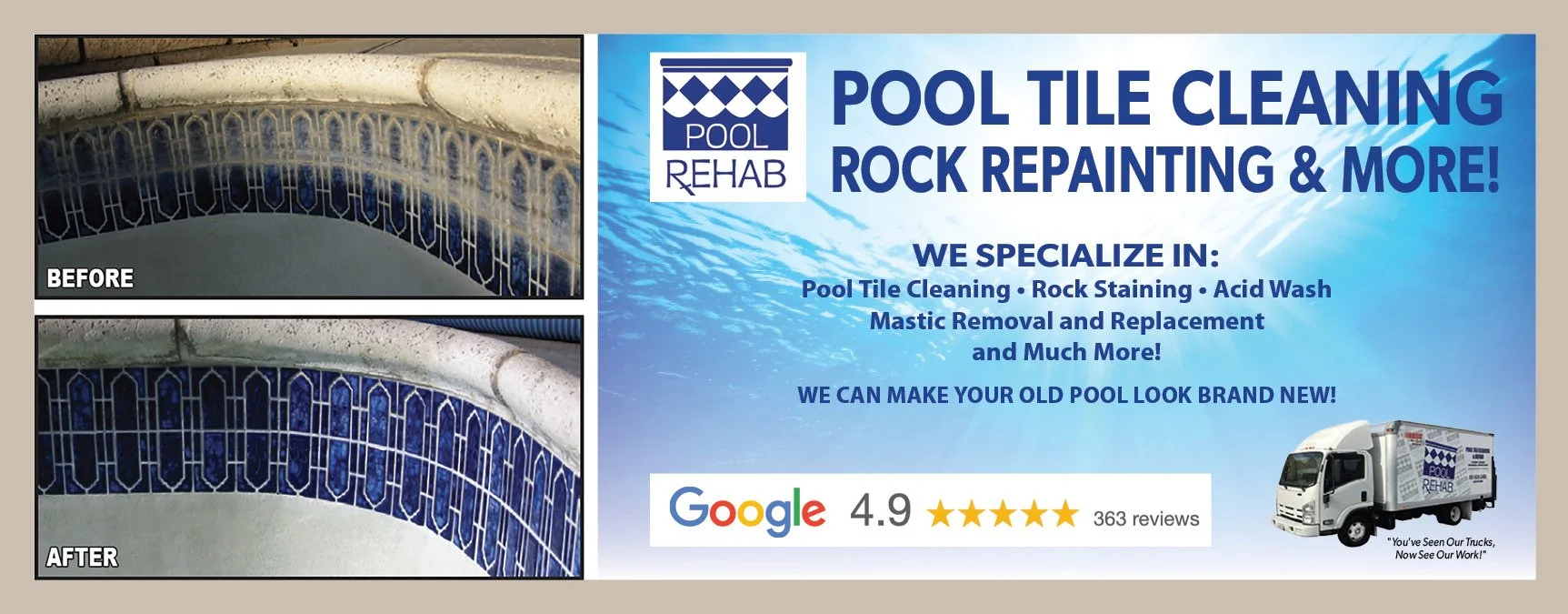 Pool Rehab offers comprehensive services including pool tile cleaning, Deck-O-Seal® servicing, tile repair, rock repair and repainting, and acid washes. Contact Pool Rehab today for a free estimate and take advantage of their $299 special to make your pool look like new again.