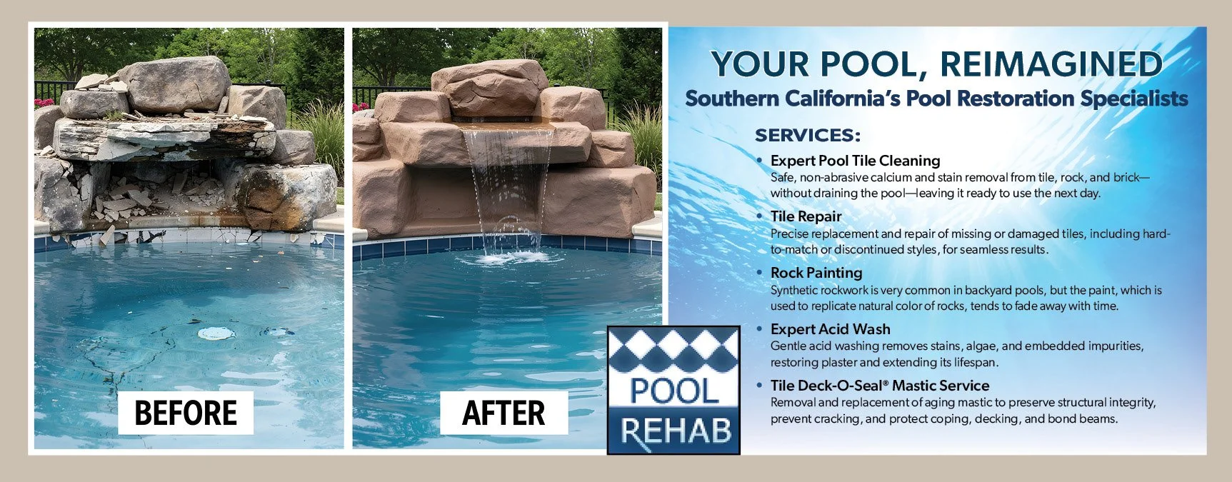 With years of experience, Pool Rehab is known for reviving pools often labeled “beyond repair” by other companies. Using precision machinery and an innovative, eco-friendly cleaning process, Pool Rehab has earned a reputation as a leading pool tile cleaning company throughout Southern California. Their advanced technology safely cleans a wide range of surfaces, including tile, brick, flagstone, quartz, Pebble Tec®, and both natural and artificial rock.