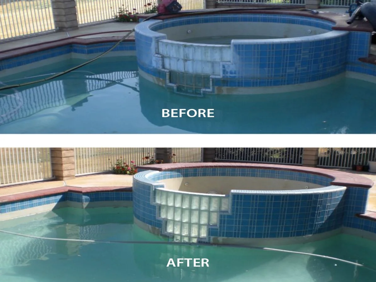 During the cleaning process, the pool’s water level is lowered and eco-friendly glass beads are applied at a low pressure of just 40 psi—significantly safer than the higher pressures commonly used by other companies. This method effectively removes calcium deposits and buildup without damaging tiles.