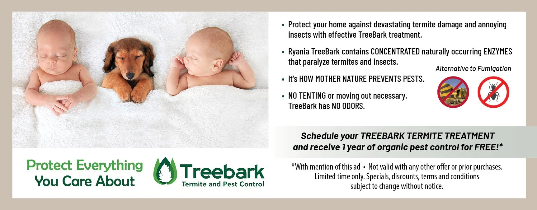 With Treebark Final Termite Control Services, client’s homes will be treated and monitored by one of our highly trained technicians for maximum effectiveness. This monitoring is over the course of years, with visits as frequent as monthly depending on the needs of the home. Call us today for a free Termite inspection for your home. Our licensed, bonded, and insured inspectors will thoroughly inspect and estimate your home. The inspector will leave you with a written estimate and brochure explaining our system of termite control.